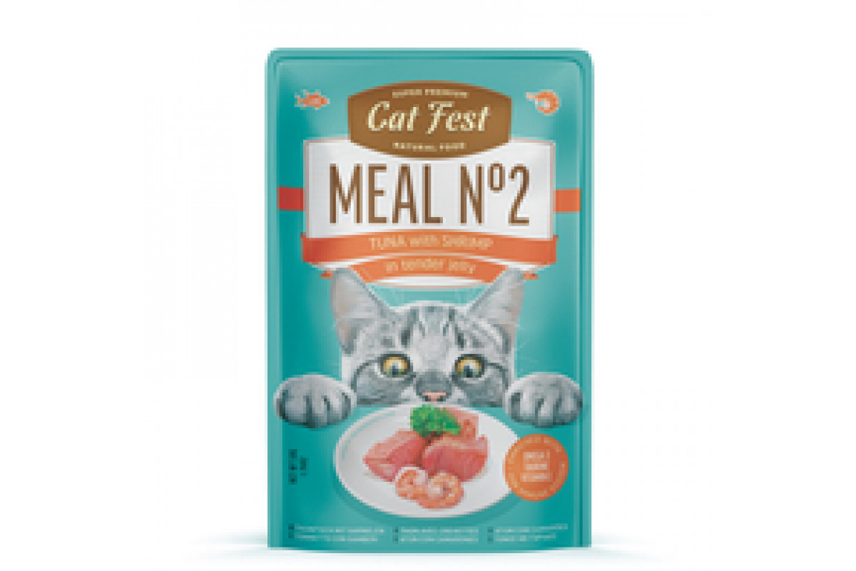CatFest Тунец с креветками в нежном желе Meal Nr2, 50 г – премиальный влажный корм для кошек из отборного тихоокеанского тунца (60%) и нежных креветок (4%). Комбинация морепродуктов придаёт блюду насыщенный вкус и аромат, который оценят даже самые привередливые питомцы. Лёгкое желе улучшает усвоение питательных веществ и делает корм ещё более аппетитным. Формула обогащена таурином, витамином Е и пребиотиком FOS для здоровья сердца, зрения, иммунитета и пищеварения. Подходит для взрослых кошек всех пород, включая стерилизованных и с чувствительным пищеварением.