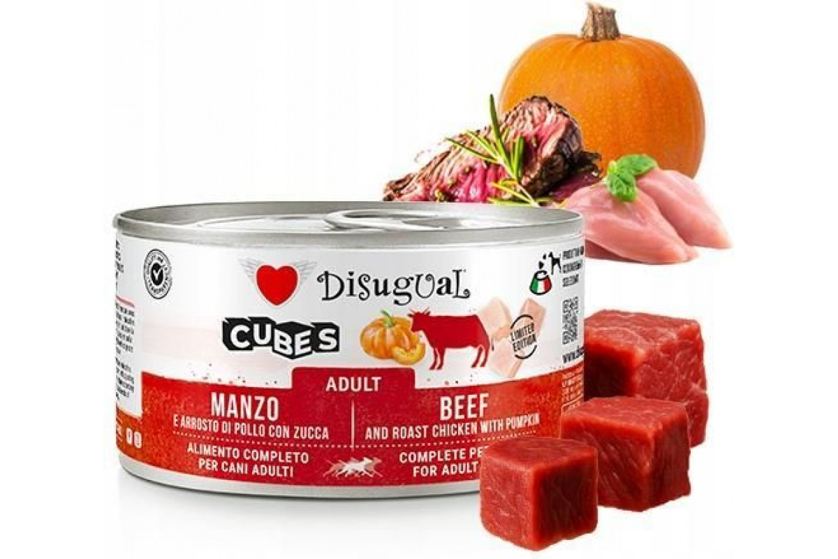 Disugual Cubes — это полнорационный влажный корм, специально разработанный для вашей собаки, с новой текстурой, сочетающей мясной фарш с вкусными кубиками и отборными овощами или злаками!