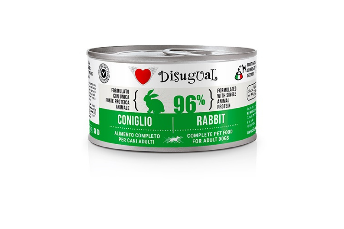 Disugual Dog MonoProtein 96% Rabbit Монопротеиновый консервированный беззерновой корм для собак Паштет из Кролика - это высококачественный натуральный влажный безглютеновый корм для собак класса холистик от итальянского бренда Disugual, известного производителя высококачественного натурального питания для собак и кошек без добавления искусственных ароматизаторов, консервантов и других химических веществ.